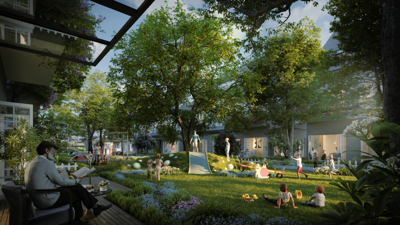 Vườn trẻ thơ được bố trí ngay trong nội khu, tích hợp đa dạng thiết bị vui chơi ngoài trời dành riêng cho trẻ em. Nơi đây trẻ được thoả sức vui chơi bên hông nhà mà không phải đi đâu xa, bố mẹ cũng hoàn toàn yên tâm khi con không rời khỏi tầm mắt.